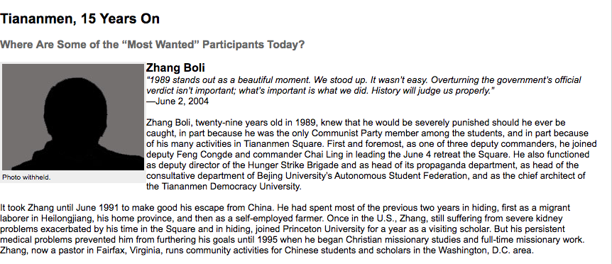 Human Rights Watch -- Tiananmen's "Most Wanted" 15 Years Later -- Zhang Boli