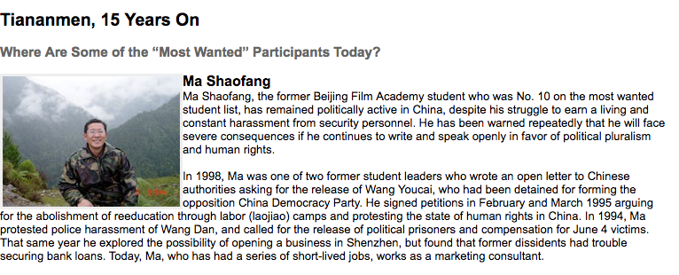 Human Rights Watch -- Tiananmen's "Most Wanted" 15 Years Later -- Ma Shaofang