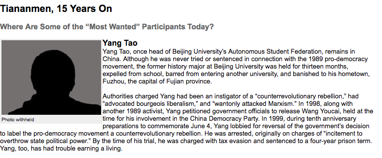 Human Rights Watch -- Tiananmen's "Most Wanted" 15 Years Later -- Yang Tao